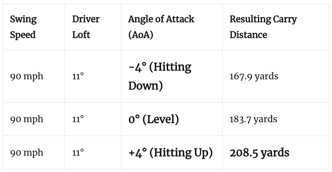 The Takeaway: By simply changing the delivery from a downward strike to an upward strike, this golfer gained over 40 yards of carry distance without swinging a single mile per hour faster.